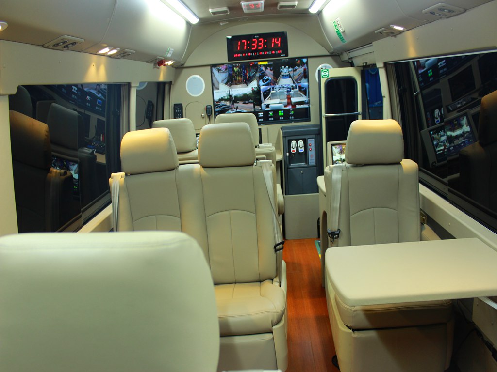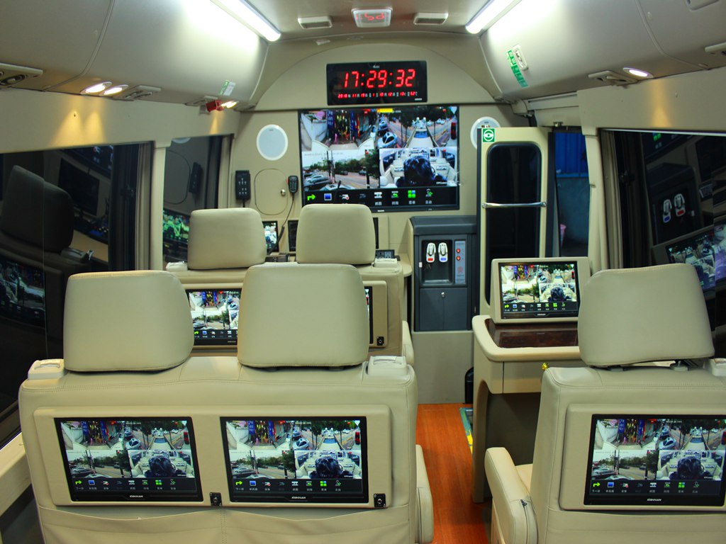 通讯指挥车采用客车底盘改装,集成现场办公、通讯、监控及无线图像传输、广播宣传、强光照明、警示及电源等功能于一体,技术含量高、布置合理、做工精细。车辆既是现场移动指挥中心,又可与指挥调度中心建立通畅通讯,灵活、机动,是公安、武警部门现场应急综